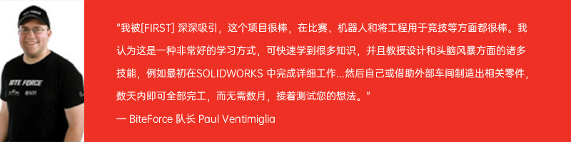 三届机器人大战冠军战队 BiteForce 的队长 Paul Ventimiglia 打造自己人生的第一个格斗机器人时只有 13 岁,首次参加比赛时也才 14 岁。战队 HyperShock 的队长 Will Bales 首次参加 机器人大战 IQ 比赛时只有 12 岁。战队 Witch Doctor 的队长 Andrea Gellatly 首次参加比赛时还是一名高中生,而战队 SawBlaze 的队长 Jamison Go 在中学时就开始参加业余的地下小型格斗机器人巡回赛。除了在年少时就参与机器人开发和参加战斗机器人比赛之外,这些深受粉丝喜爱的机器人大战战队的队长还有其他一些共同点:他们都选择使用SOLIDWORKS® 设计和工程解决方案来快速开发每个赛季的格斗机器人。
